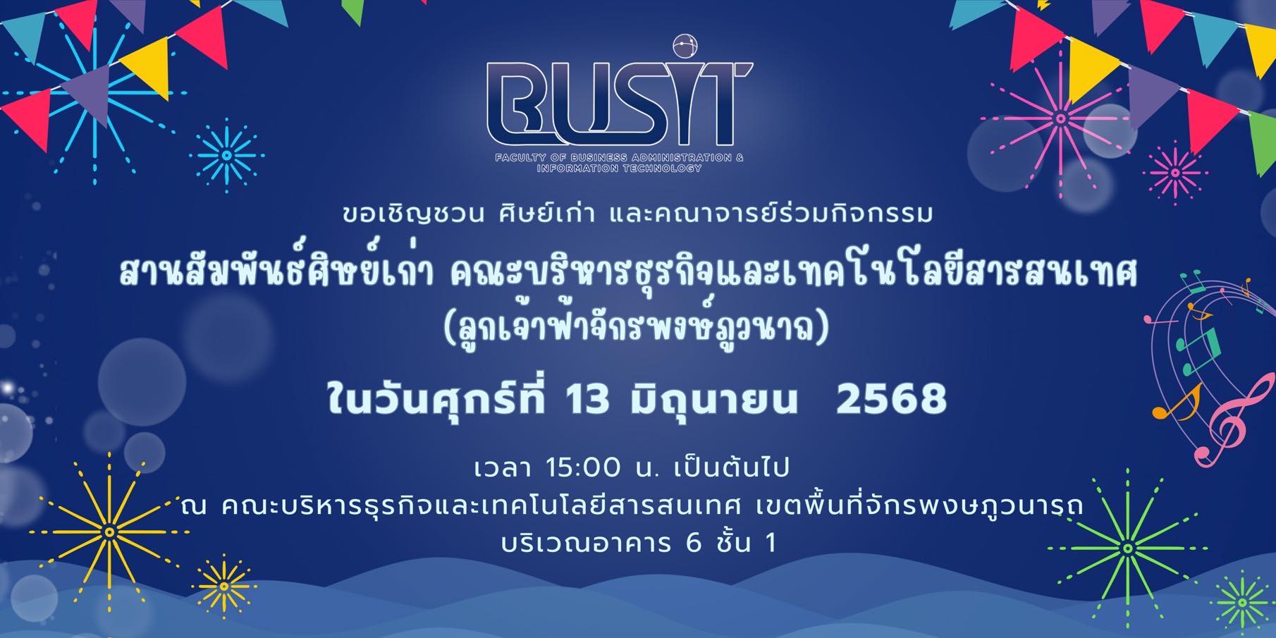 ขอเชิญชวนศิษย์เก่า เข้าร่วมกิจกรรม “สานสัมพันธ์ศิษย์เก่า คณะบริหารธุรกิจและเทคโนโลยีสารสนเทศ (ลูกเจ้าฟ้าจักรพงษ์ภูวนาถ)” วันศุกร์ที่ 13 มิถุนายน 2568 เริ่มเวลา 15:00 น. เป็นต้นไป ณ คณะบริหารธุรกิจและเทคโนโลยีสารสนเทศ เขตพื้นที่จักรพงษภูวนารถ บริเวณใต้อาคาร 6 ชั้น 1 สามารถลงทะเบียนเข้าร่วมงาน และร่วมกิจกรรมดนตรี NIGHT PARTY MUSIC หรือแสดงวงดนตรีสดได้ที่: https://forms.gle/uZkcRogXZxTmfCju9 พบกับกิจกรรมดนตรี NIGHT PARTY MUSIC ที่เปิดโอกาสให้ คณาจารย์ เจ้าหน้าที่ ศิษย์เก่า และศิษย์ปัจจุบัน ได้มาแสดงความสามารถบนเวทีอย่างอิสระ ไม่ว่าจะเป็น ร้องเพลง วงดนตรี หรือโชว์อื่น ๆ ภายในงานพบกับ บูทกิจกรรมสนุก ๆ ของรางวัลมากมาย และของที่ระลึกสุดพิเศษที่จะเปิดพรีออเดอร์เร็ว ๆ นี้