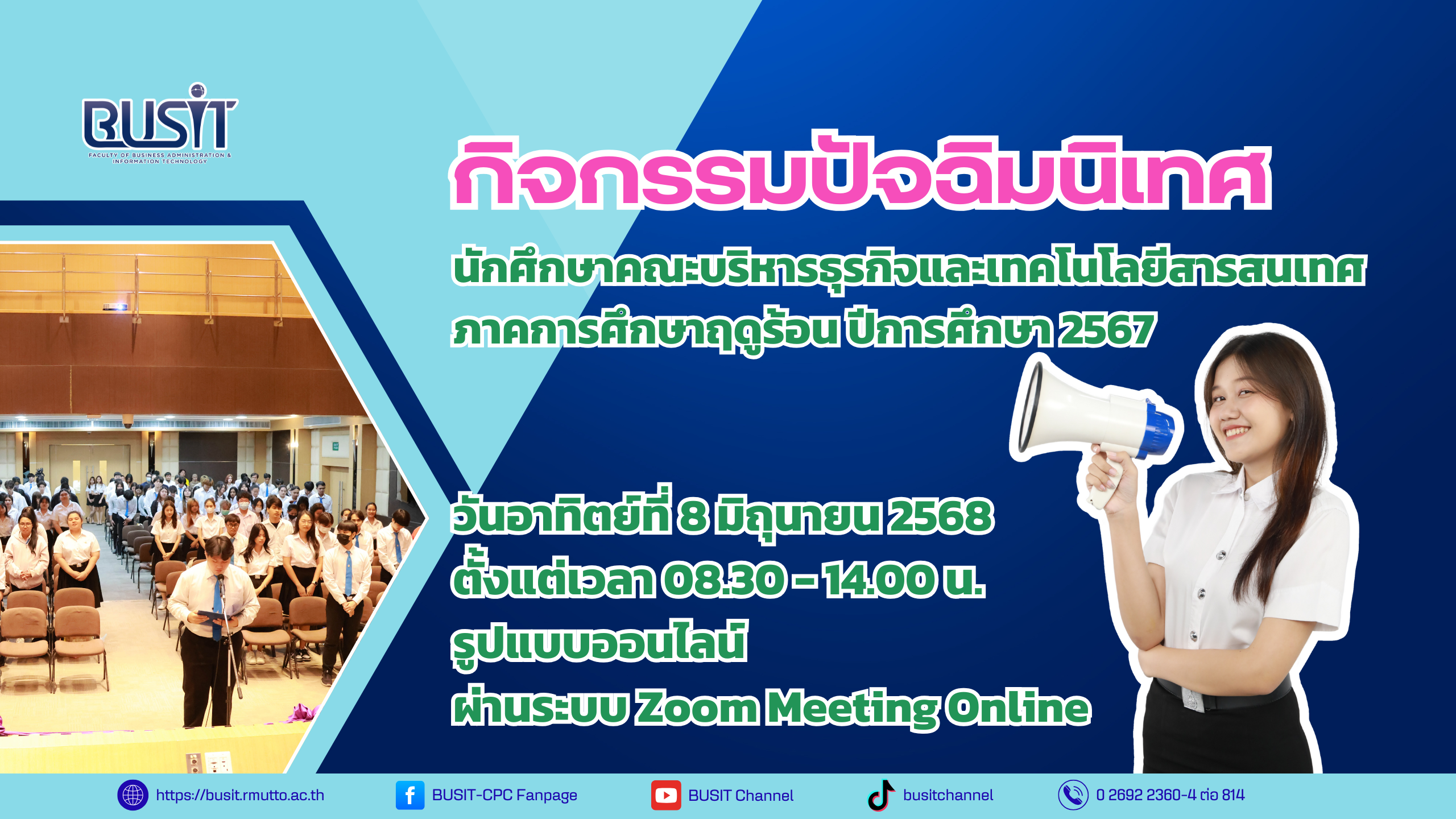 คณะบริหารธุรกิจและเทคโนโลยีสารสนเทศ กำหนดจัดกิจกรรมปัจฉิมนิเทศ นักศึกษาคณะบริหารธุรกิจและเทคโนโลยีสารสนเทศ ภาคการศึกษาฤดูร้อน ปีการศึกษา 2567 ในวันอาทิตย์ที่ 8 มิถุนายน 2568 ตั้งแต่เวลา 08.30 – 14.00 น. โดยจัดในรูปแบบออนไลน์ ผ่านระบบ Zoom Meeting Online ———————————————- ลิงก์เข้าระบบ Zoom Meeting Online https://shorturl.at/1sCn7 Meeting ID: 854 9601 9183Passcode: 108867